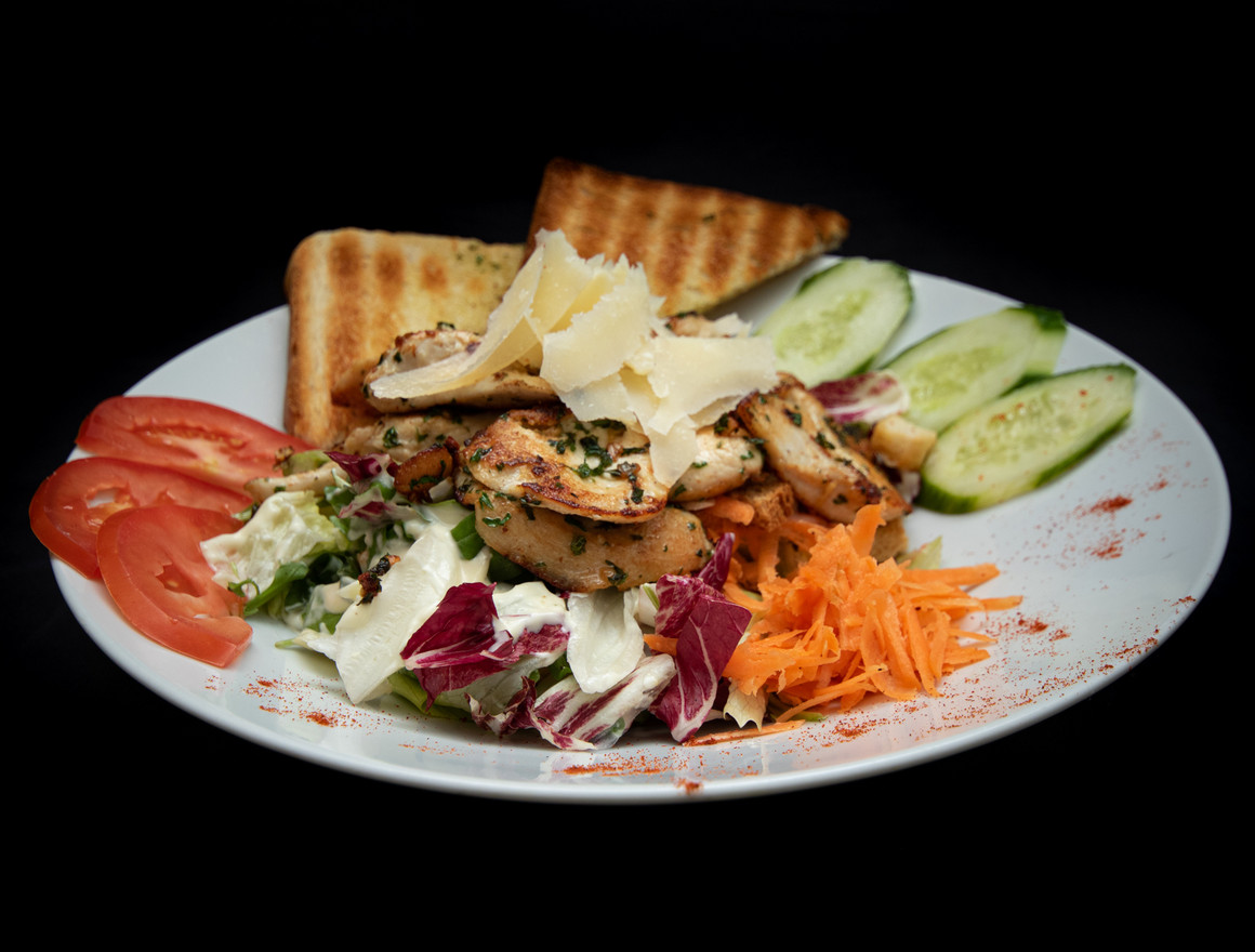 | salade, tomate, concombre, carotte, poulet grillé, parmesan et toast |