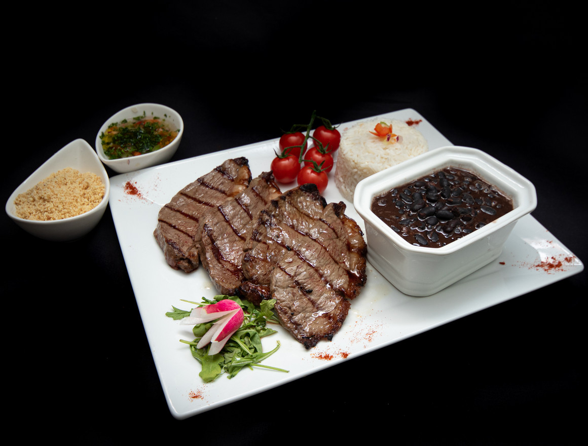 | 300g de viande accompagné d'haricots noirs, riz, frites, sauce vierge et farine de manioc |